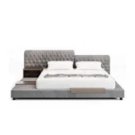 El cabecero es un elemento clave en este modelo, con un diseño amplio y decorativo que realza la estética del espacio. Tapizado con tela de alto gramaje, proporciona un acabado refinado y de gran calidad, además de ser resistente al desgaste y fácil de mantener. Su estructura cuenta con detalles decorativos que añaden un toque distintivo, creando un ambiente sofisticado y acogedor.