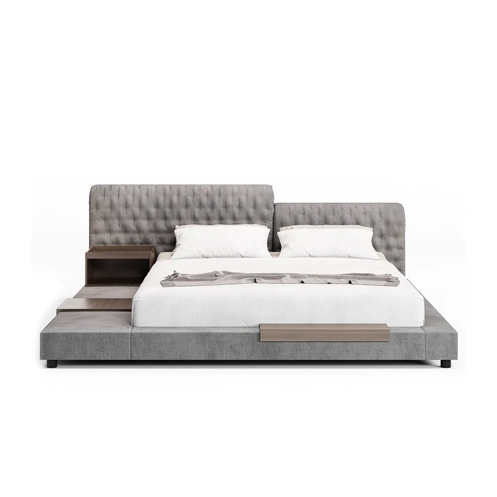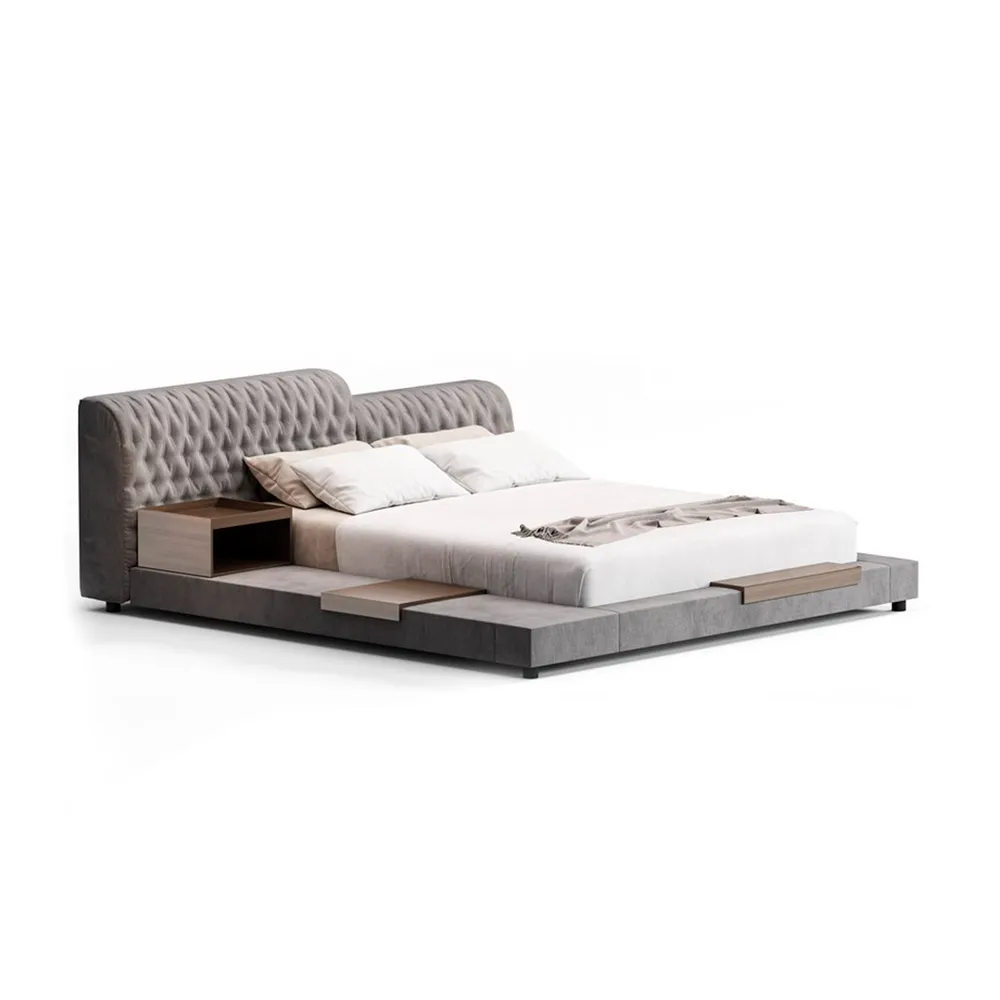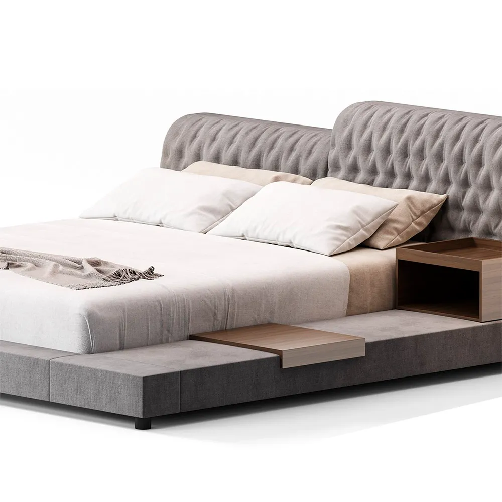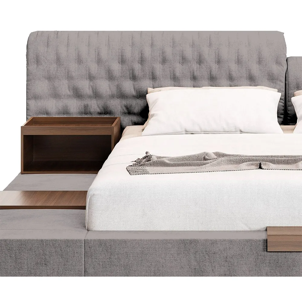 "Este modelo de cama destaca por su diseño minimalista y su estructura baja, brindando una apariencia moderna y sofisticada. Su base acolchonada, completamente tapizada, envuelve la cama y se fusiona con un cabecero integrado que aporta comodidad y elegancia.
