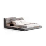 Esta cama de diseño sofisticado y elegante destaca por su estructura robusta y detalles cuidadosamente elaborados. Fabricada en madera tornillo, garantiza una base resistente y duradera, ideal para soportar el uso diario sin comprometer su estabilidad. Su diseño se adapta a diversos estilos de decoración, aportando un toque de lujo y modernidad al dormitorio.