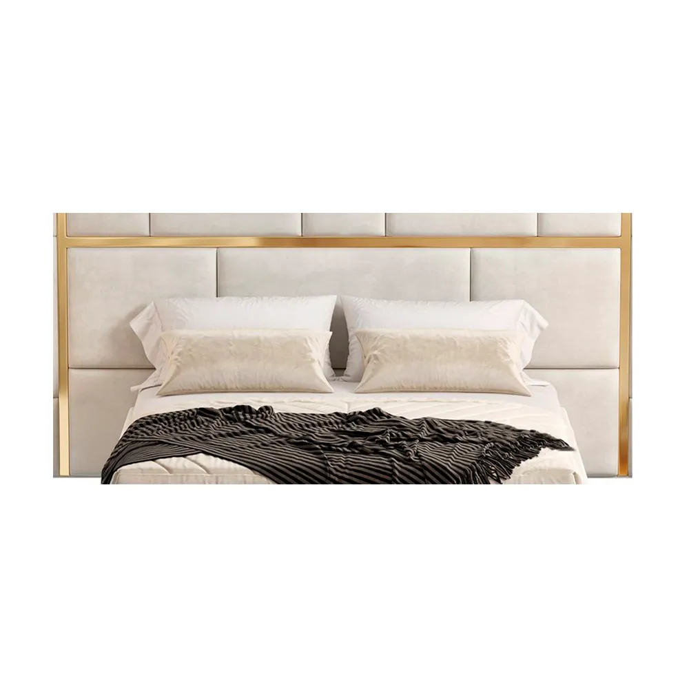 La base de la cama mantiene una continuidad con la cabecera, presentando un tapizado suave y una estructura robusta que garantiza estabilidad y confort. Su diseño de líneas rectas y acabados impecables contribuye a una apariencia lujosa y versátil, ideal para distintos estilos de decoración.