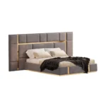 Este modelo de cama y cabecera presenta un diseño contemporáneo con una estética elegante y minimalista. La cabecera de gran tamaño se compone de paneles acolchonados dispuestos de manera uniforme, creando un efecto visual armonioso y sofisticado. Su estructura incorpora detalles lineales que resaltan la geometría del diseño, aportando un toque moderno y refinado.