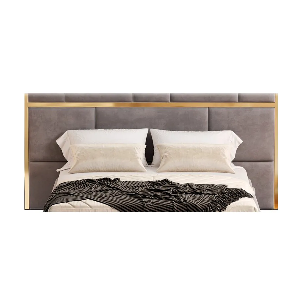 La base de la cama mantiene una continuidad con la cabecera, presentando un tapizado suave y una estructura robusta que garantiza estabilidad y confort. Su diseño de líneas rectas y acabados impecables contribuye a una apariencia lujosa y versátil, ideal para distintos estilos de decoración.