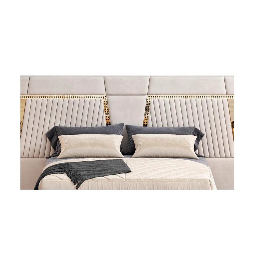 El respaldo acolchado incorpora espuma de alta densidad, lo que garantiza un soporte cómodo y ergonómico. La tapicería, elaborada con tela de alto gramaje, no solo aporta una textura suave y agradable al tacto, sino que también asegura una larga vida útil y resistencia al desgaste. Un detalle distintivo de este modelo es la combinación de paneles acolchados verticales con secciones lisas y detalles en espejo, que aportan un efecto visual dinámico y moderno. Este diseño fusiona lujo y funcionalidad, siendo ideal para quienes buscan un mobiliario con carácter, comodidad y materiales de alta calidad. Su estructura robusta y acabados impecables lo convierten en un elemento central dentro de la decoración contemporánea.»