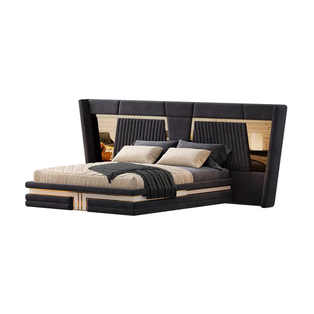 El respaldo acolchado incorpora espuma de alta densidad, lo que garantiza un soporte cómodo y ergonómico. La tapicería, elaborada con tela de alto gramaje, no solo aporta una textura suave y agradable al tacto, sino que también asegura una larga vida útil y resistencia al desgaste. Un detalle distintivo de este modelo es la combinación de paneles acolchados verticales con secciones lisas y detalles en espejo, que aportan un efecto visual dinámico y moderno. Este diseño fusiona lujo y funcionalidad, siendo ideal para quienes buscan un mobiliario con carácter, comodidad y materiales de alta calidad. Su estructura robusta y acabados impecables lo convierten en un elemento central dentro de la decoración contemporánea."