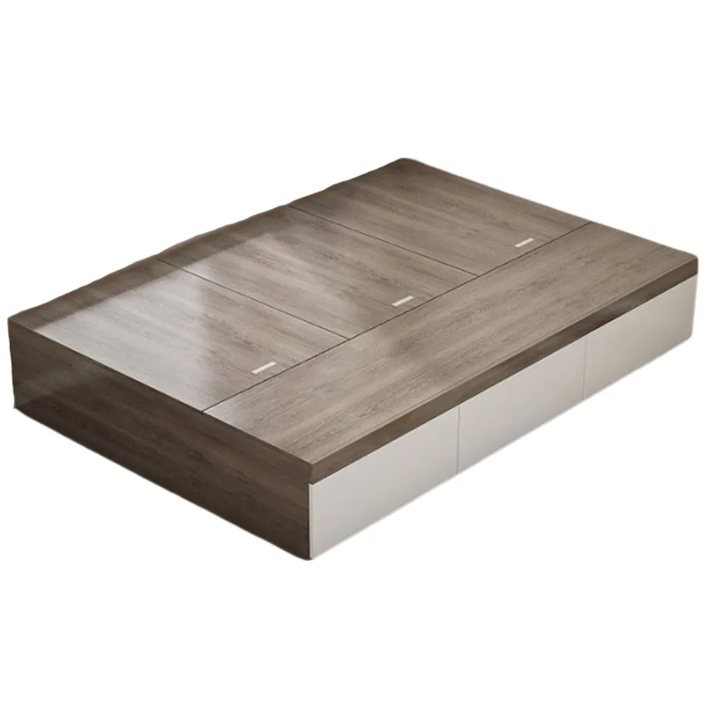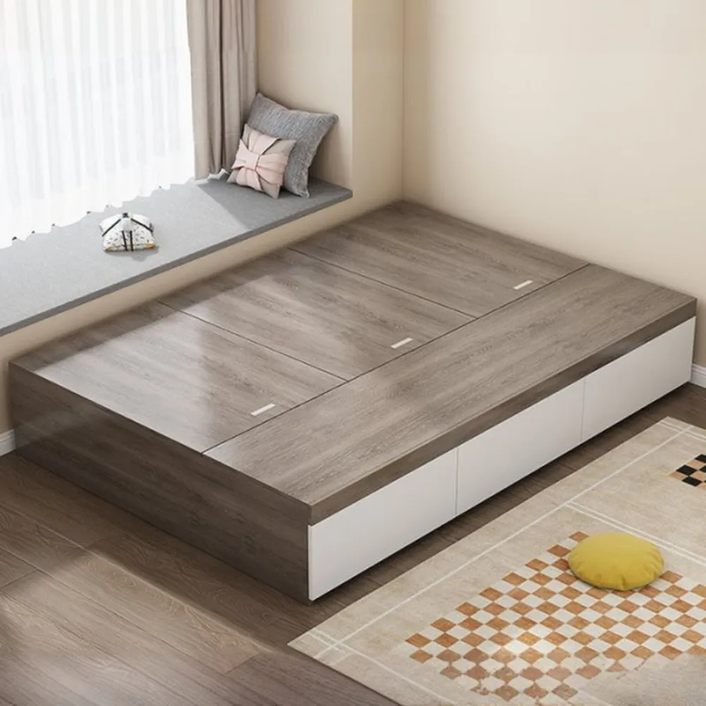 Cama multifuncional fabricada en melamina, diseñada para optimizar el espacio con un estilo moderno y minimalista. Su estructura incorpora compartimentos de almacenamiento ocultos en la parte superior, accesibles mediante paneles abatibles, ideales para guardar ropa de cama, libros u otros objetos personales.