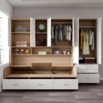 A un costado, incluye un armario espacioso con barras para colgar ropa, compartimentos cerrados y cajones adicionales que maximizan su funcionalidad. Gracias a su estructura versátil, combina descanso y organización en un solo mueble, siendo ideal para habitaciones con espacio reducido o para quienes buscan mantener un ambiente ordenado y práctico. Su diseño moderno y bien distribuido lo convierte en una solución integral para aprovechar al máximo cada rincón del dormitorio.