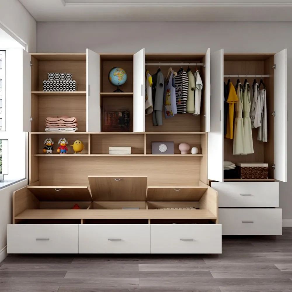 Esta cama multifuncional es una excelente opción para optimizar el espacio en cualquier habitación. Su diseño inteligente incorpora múltiples compartimentos de almacenamiento que permiten organizar ropa, juguetes, libros y otros objetos sin ocupar espacio adicional. Bajo la cama, dispone de amplios cajones deslizantes que facilitan el acceso a elementos esenciales. Además, el cabecero y la parte superior cuentan con estantes abiertos y armarios cerrados, ideales para exhibir decoraciones o mantener pertenencias ordenadas.