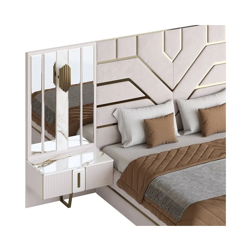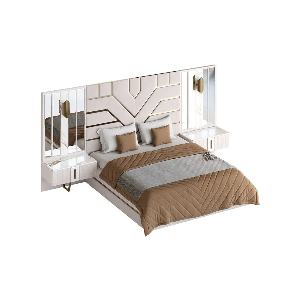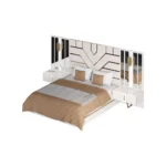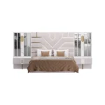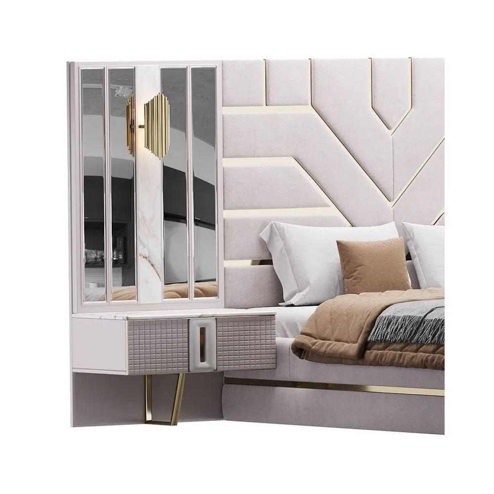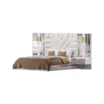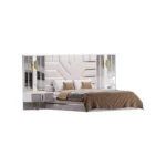«Cama de diseño moderno y sofisticado, fabricada con estructura de madera tornillo para mayor resistencia y durabilidad. Su cabecera amplia y acolchonada está elaborada con espuma de alta densidad, proporcionando comodidad y soporte. Detalles decorativos y paneles con espejos integrados realzan su estilo elegante. Tapizada con tela de alto gramaje, garantizando un acabado refinado y de alta calidad. Incluye burós flotantes con cajones y detalles metálicos, ideales para almacenamiento y funcionalidad.»