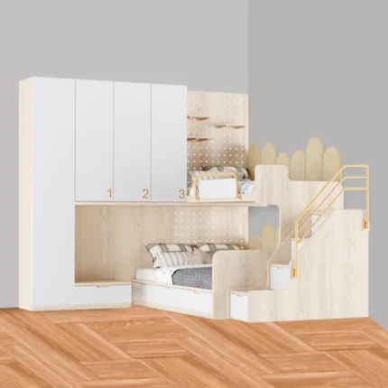 - El colchón se complementa con cojines en tonos neutros y mostaza, creando un ambiente acogedor. Perfecta para habitaciones infantiles, esta cama integra descanso, almacenamiento y diseño en una sola estructura funcional y moderna.