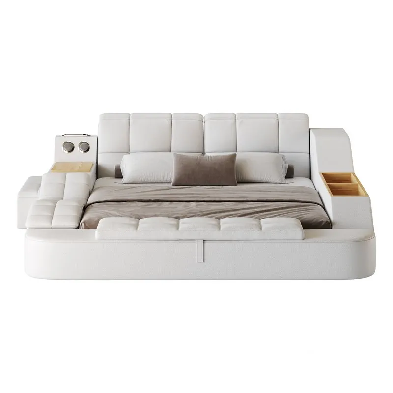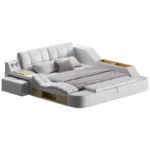 Esta cama multifuncional combina comodidad, diseño innovador y funcionalidad en un solo mueble. Su estructura robusta y de líneas modernas integra diferentes elementos que la convierten en una opción versátil para cualquier dormitorio.
