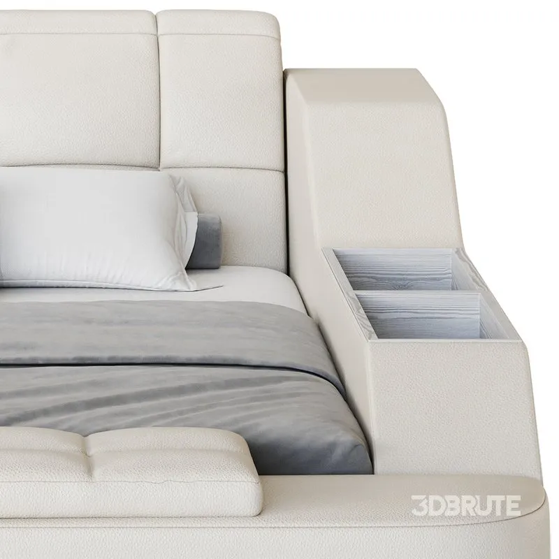 La cabecera acolchonada proporciona un respaldo ergonómico ideal para el descanso o la lectura. A los lados, incorpora superficies de apoyo y compartimentos de almacenamiento que permiten tener objetos esenciales al alcance de la mano. Además, cuenta con un sistema integrado que incluye puertos y controles, agregando un aspecto tecnológico a su diseño.