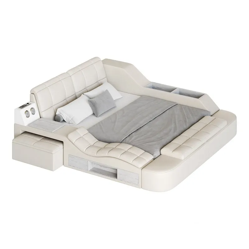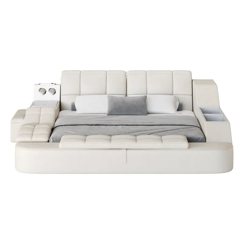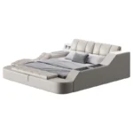 Esta cama multifuncional combina comodidad, diseño innovador y funcionalidad en un solo mueble. Su estructura robusta y de líneas modernas integra diferentes elementos que la convierten en una opción versátil para cualquier dormitorio.