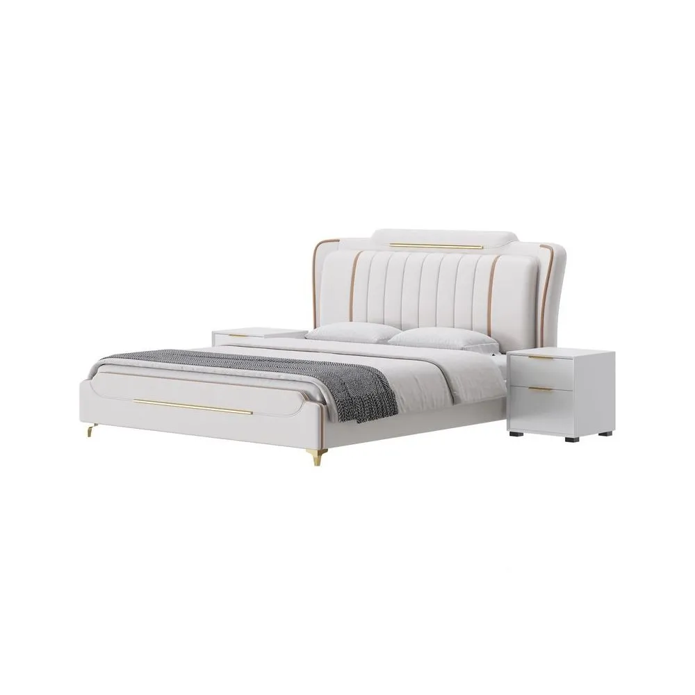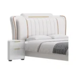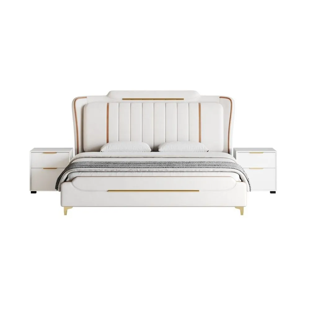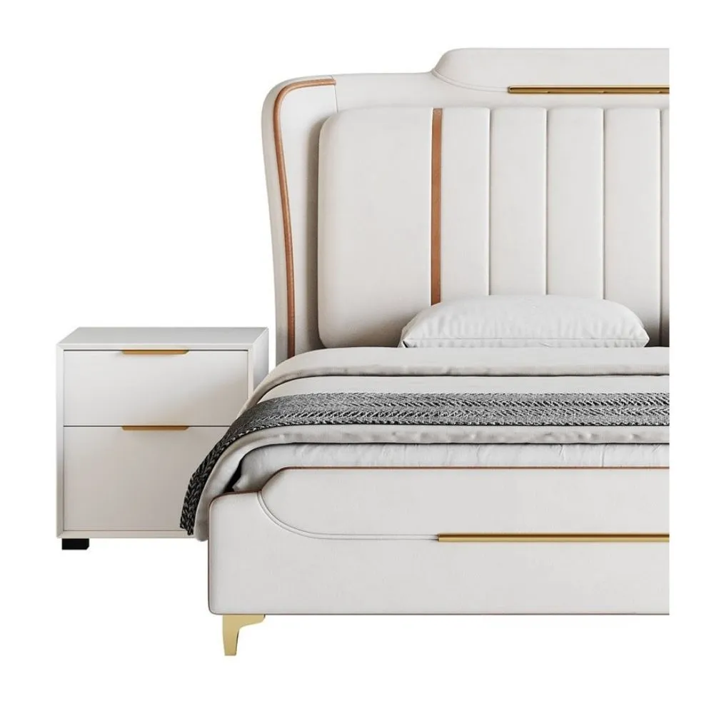 La base de la cama mantiene una estética armoniosa con la cabecera, garantizando estabilidad y solidez. Su tapizado suave y bien acabado brinda una sensación acogedora y cálida. Además, el diseño se complementa con mesas de noche minimalistas que añaden funcionalidad sin restar elegancia.