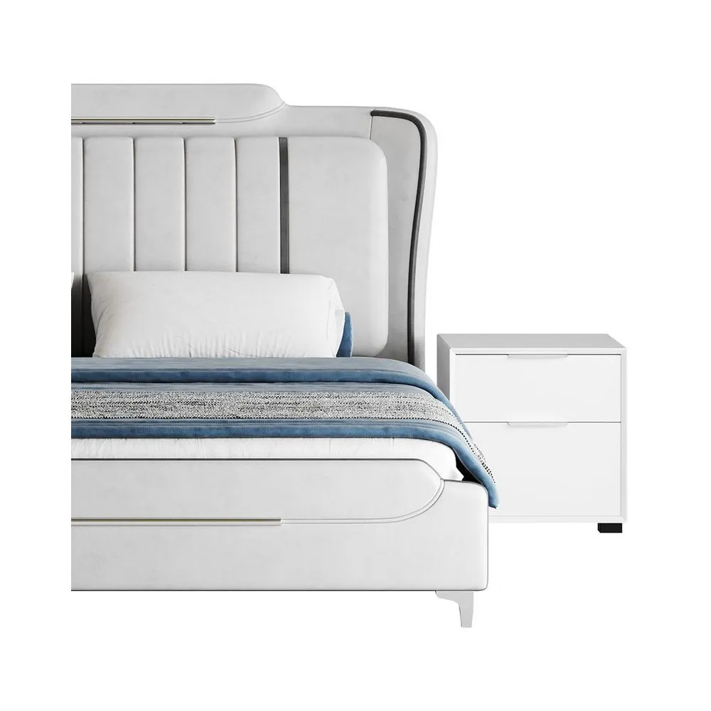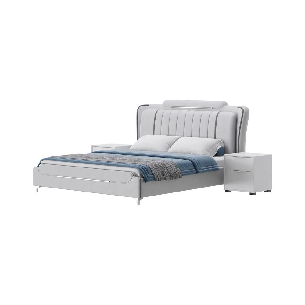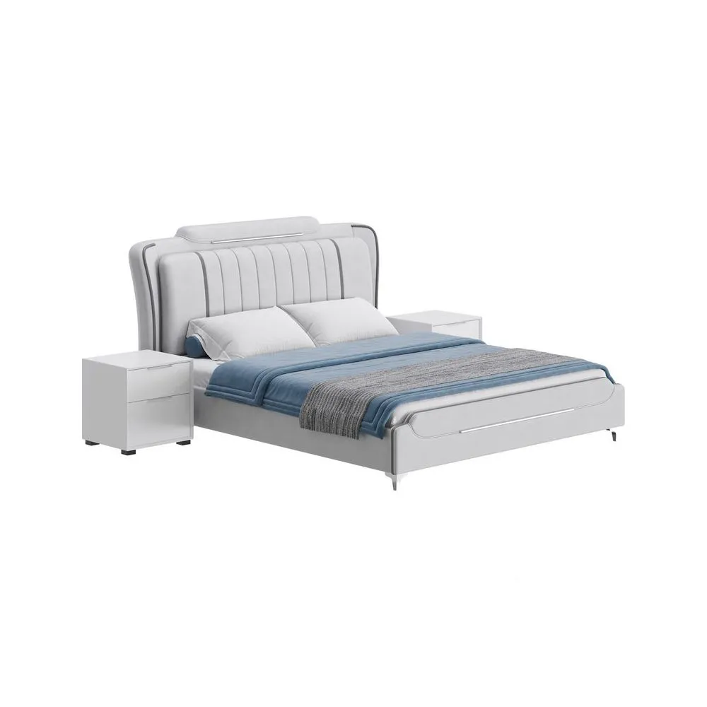 Incorpora detalles metálicos en la cabecera y la base, añadiendo un toque de distinción. Su diseño incluye patas elevadas, lo que facilita la limpieza debajo de la cama. Además, las mesas de noche complementarias aportan funcionalidad y armonía al conjunto, creando un ambiente acogedor y bien organizado.»