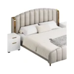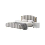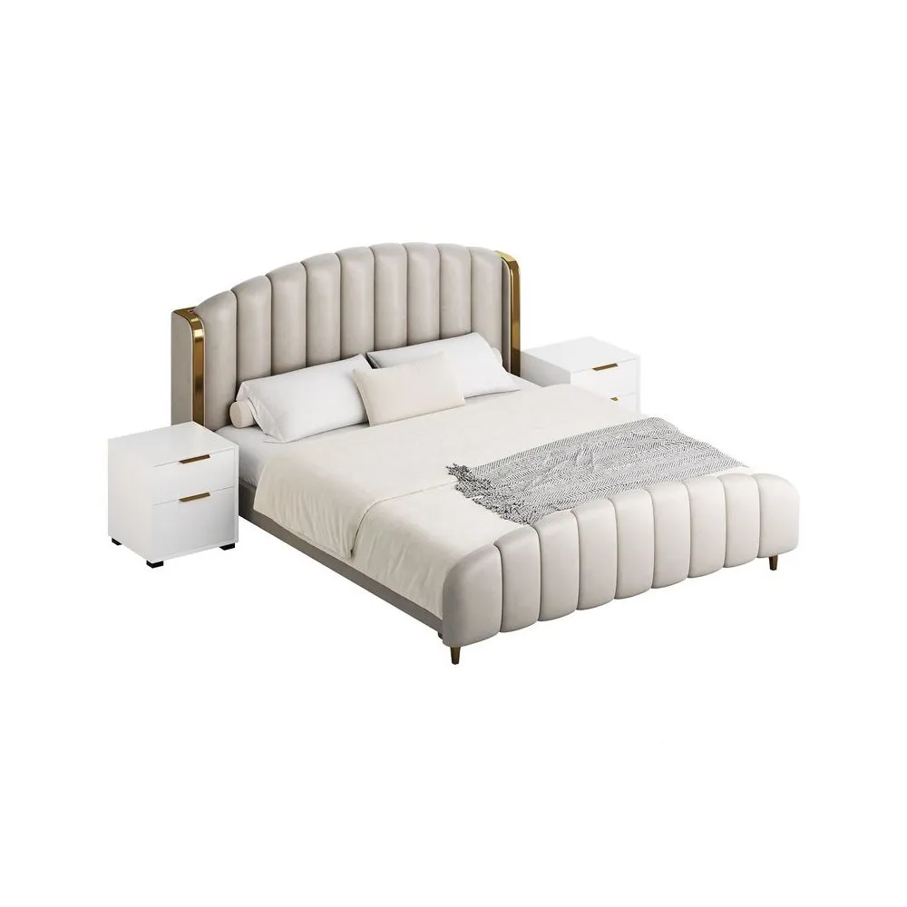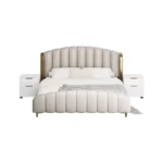 «Este modelo de cama tiene un diseño elegante y moderno con una cabecera curva y acolchonada en un estilo capitoné vertical. El tapizado en blanco con detalles metálicos en los bordes le da un aspecto sofisticado y limpio. La base de la cama sigue la misma línea de diseño, con un acabado acolchado que envuelve toda la estructura, proporcionando un aspecto armonioso. Los muebles complementarios, como las mesas de noche blancas con líneas minimalistas, refuerzan la estética contemporánea.