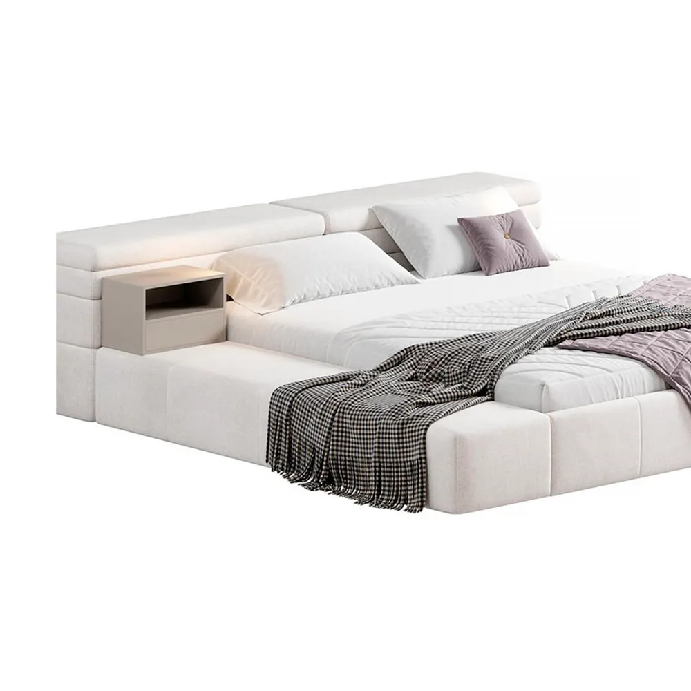 Las amplias plataformas laterales aportan versatilidad, funcionando como asiento o superficie auxiliar. Su acabado acolchonado con costuras en relieve añade un toque de lujo y confort. Es la opción ideal para quienes buscan un equilibrio entre diseño innovador, practicidad y máxima comodidad en su dormitorio.