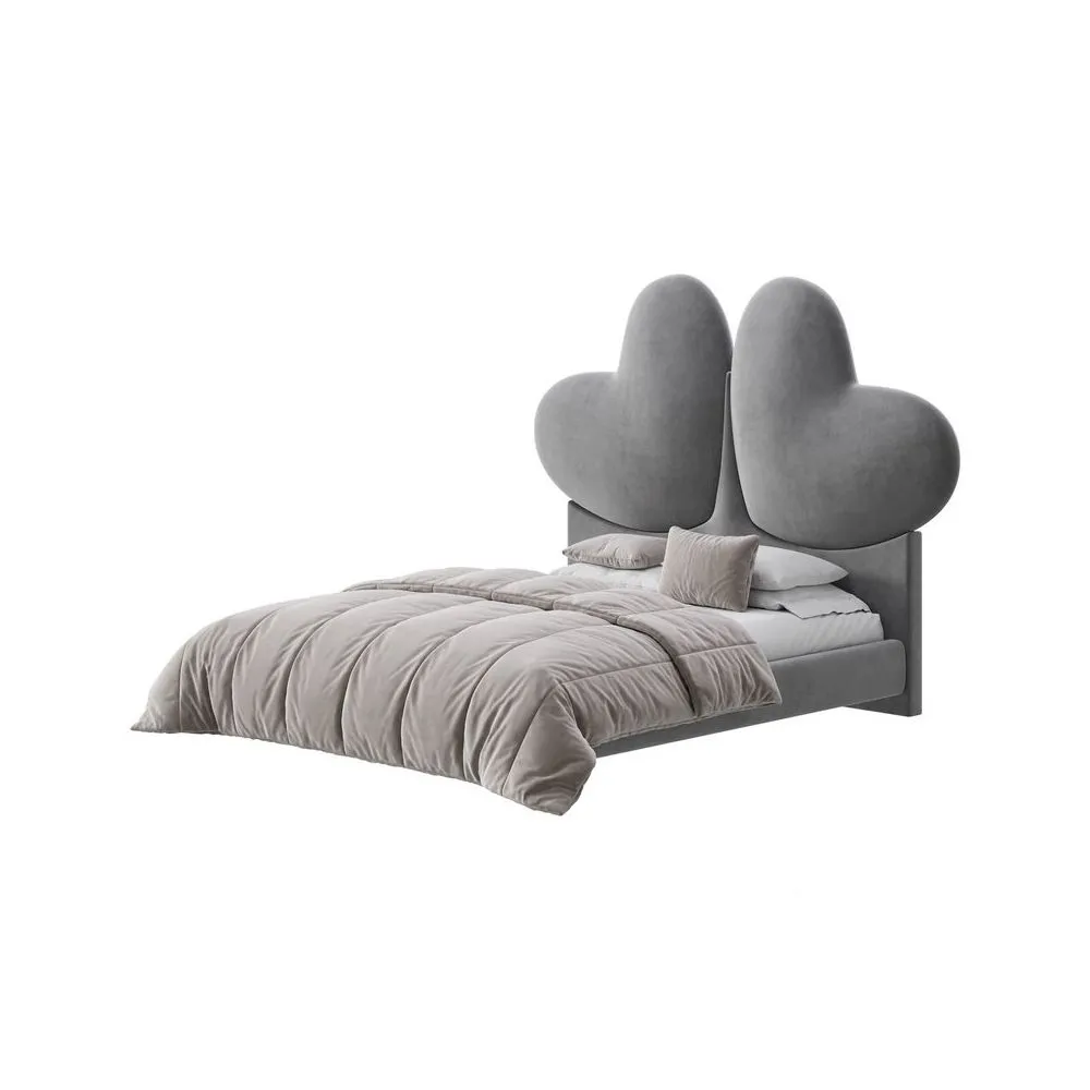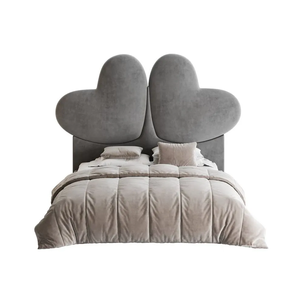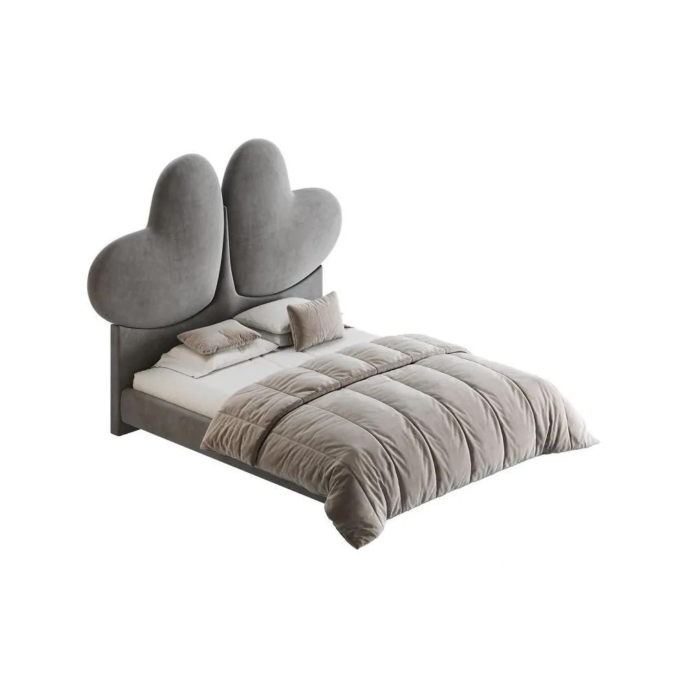 «Este modelo de cama tiene un diseño único y llamativo, con una cabecera en forma de dos corazones acolchonados, lo que le da un aspecto romántico y encantador.