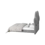 El tapizado en terciopelo gris aporta una sensación de lujo y suavidad, mientras que la estructura baja y minimalista la hace ver moderna y acogedora. Es ideal para dormitorios con un estilo juvenil, moderno o incluso temático, brindando un toque de personalidad y originalidad al espacio.»