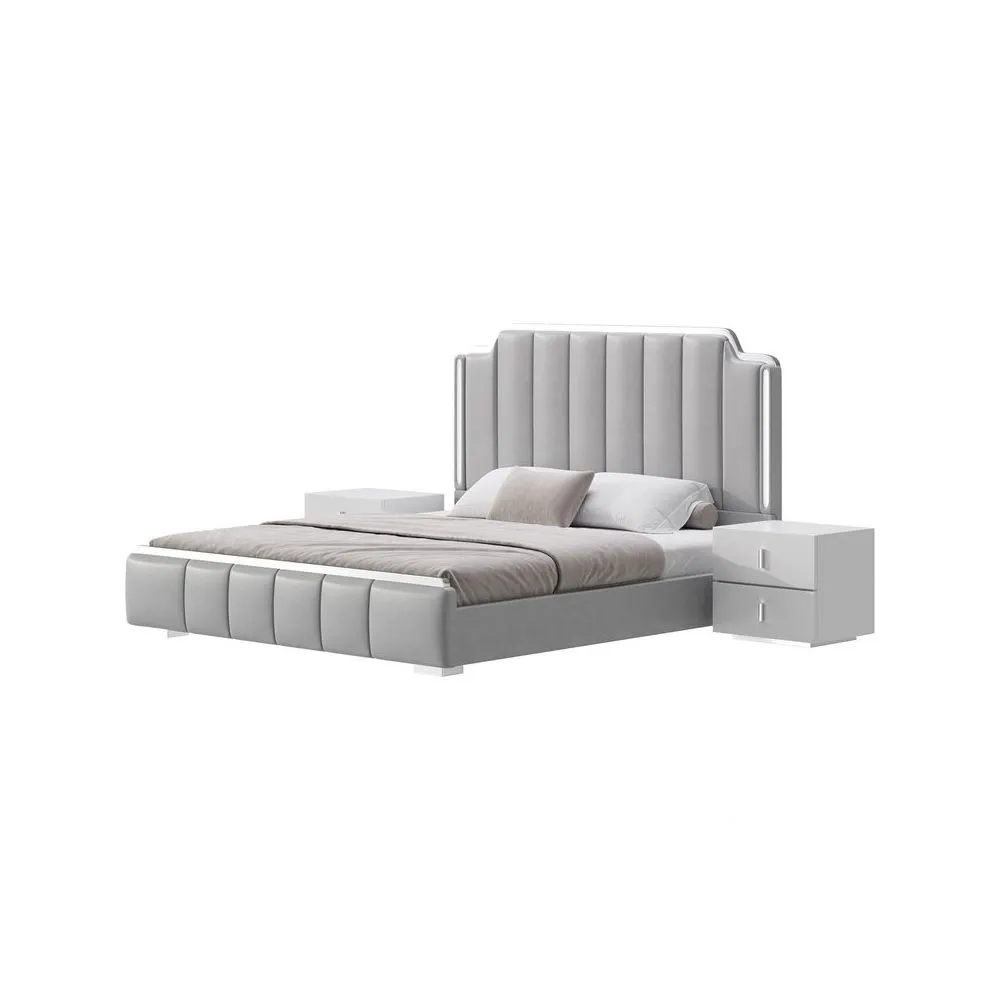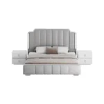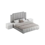 La base de la cama sigue el mismo estilo, con un acolchado sutil y detalles dorados en las esquinas, creando armonía con la cabecera. Las mesas de noche a juego, con tiradores y bases doradas, complementan perfectamente el diseño. El uso de colores neutros como el blanco y el gris, combinado con los toques dorados, hace que esta cama sea una excelente opción para espacios con un estilo moderno y glamuroso.»
