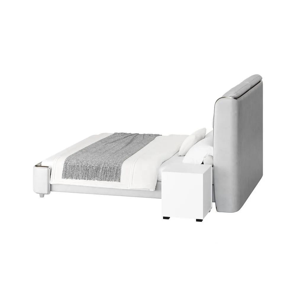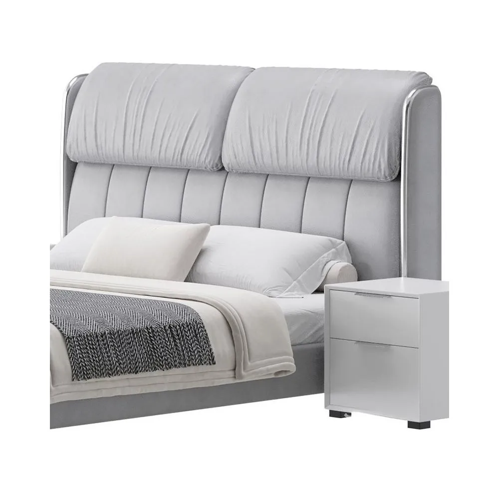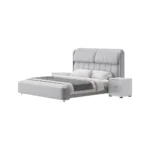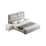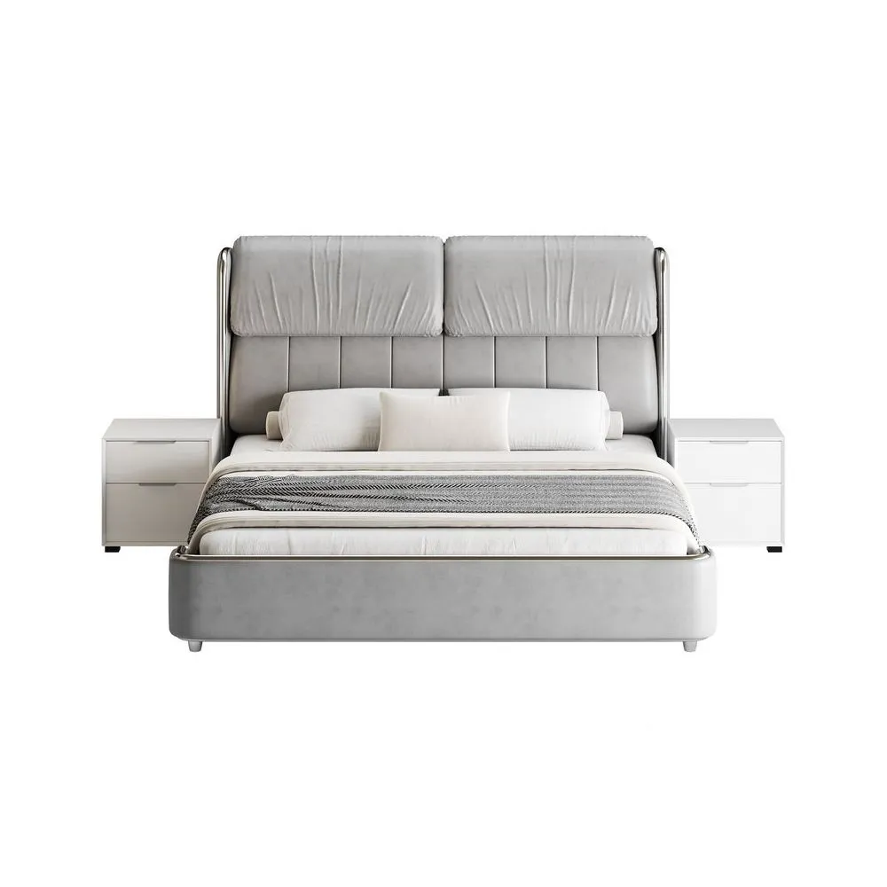 Acompañada de dos veladores a juego, esta cama añade practicidad sin comprometer la estética. Los veladores cuentan con un diseño minimalista, con amplios cajones para almacenamiento y una superficie espaciosa para lámparas o accesorios decorativos.