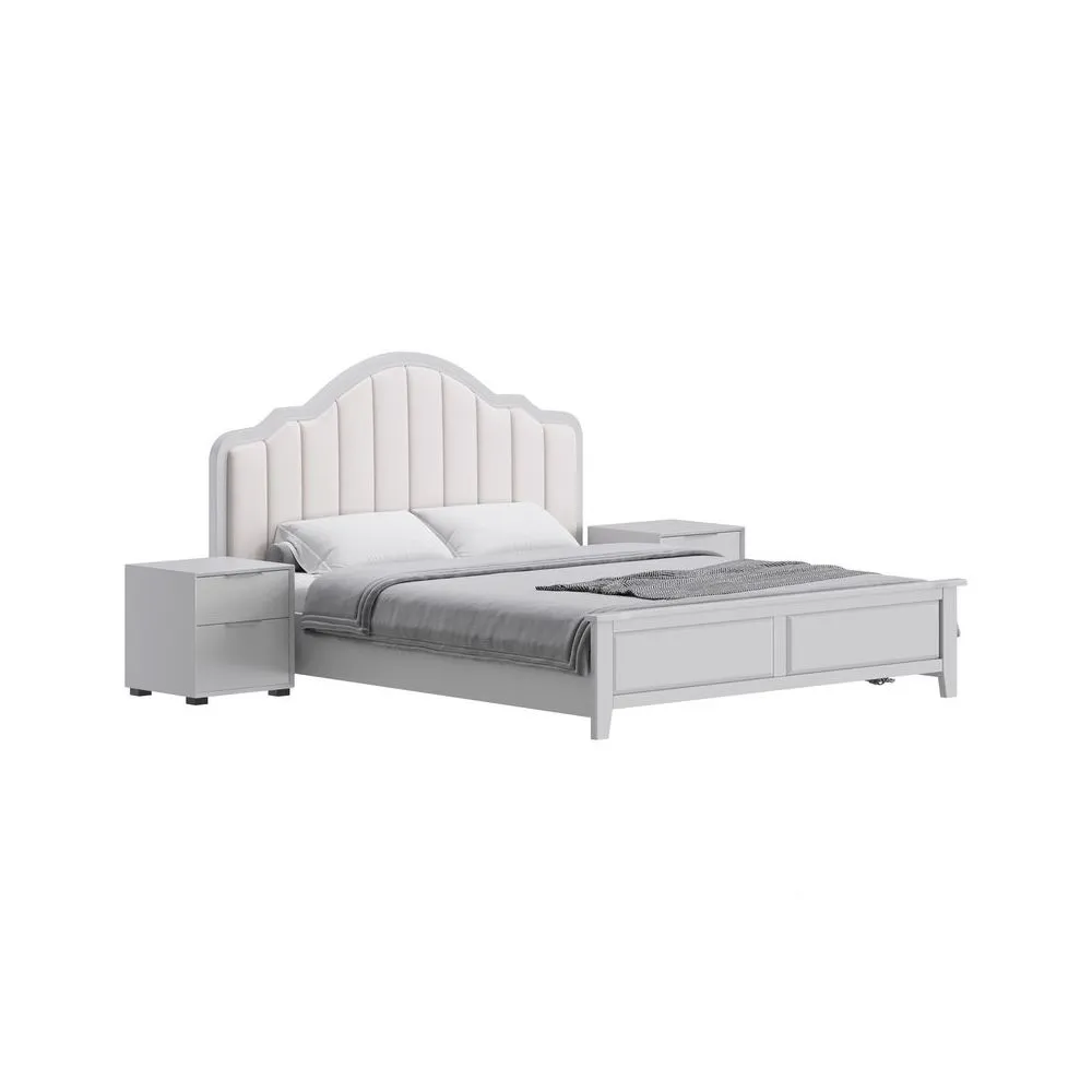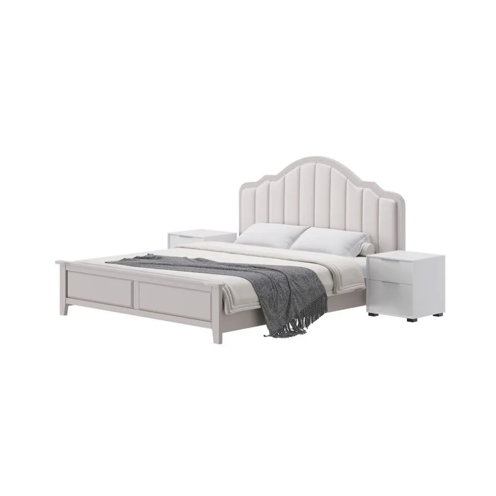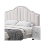 «Este diseño de cama tiene un estilo clásico y elegante con un toque moderno. La cabecera arqueada, acolchonada y tapizada en tela suave, en combinación con los detalles en madera, le da un aspecto sofisticado y acogedor.