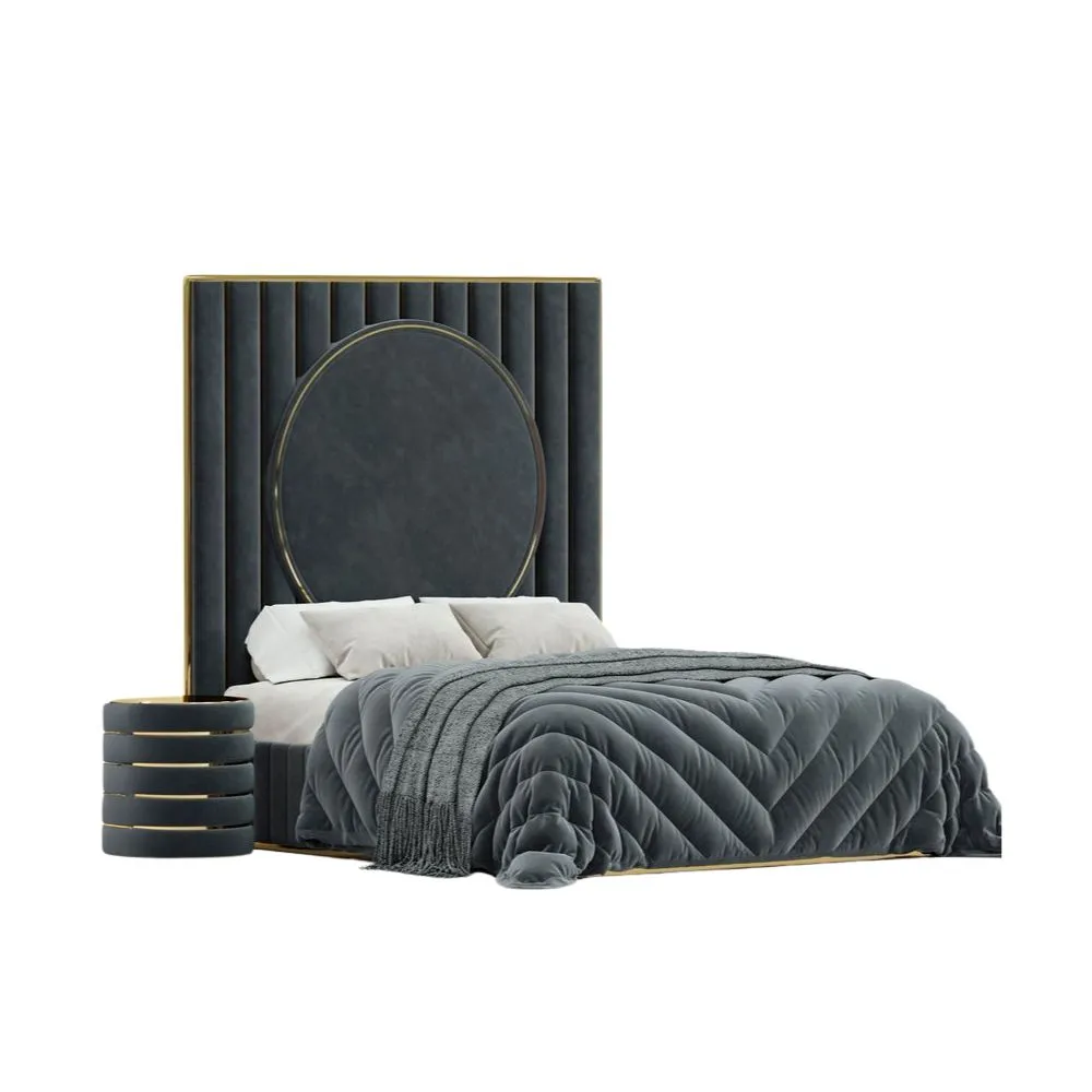 El tapizado en terciopelo le da un toque lujoso y elegante, mientras que las líneas verticales en la cabecera aportan estructura y profundidad al diseño. La combinación de colores, ya sea en tonos claros o en negro, permite adaptarla a distintos estilos decorativos, desde un ambiente contemporáneo hasta uno más glamuroso. Además, las mesas de noche cilíndricas con detalles dorados complementan perfectamente la estética, agregando un elemento moderno y funcional.»