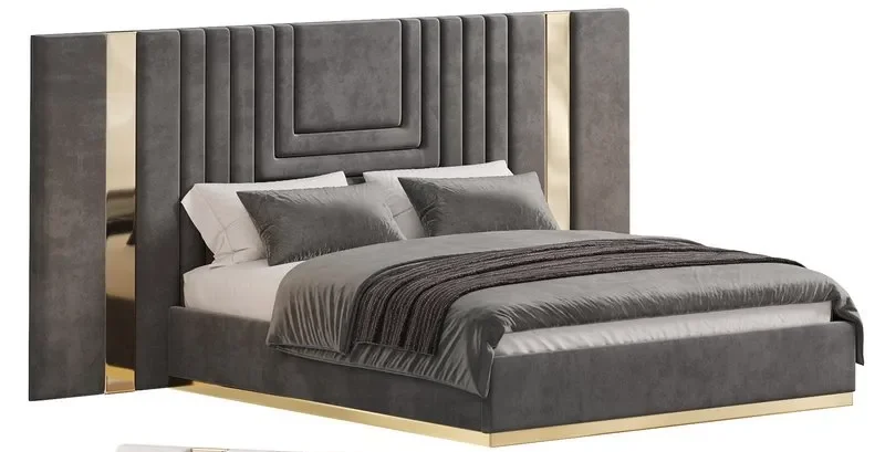 Cama Tapizada Madlen Queen – Gris y Dorado