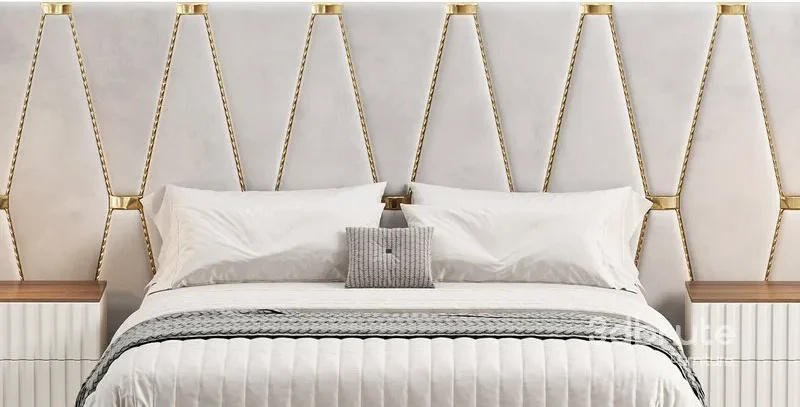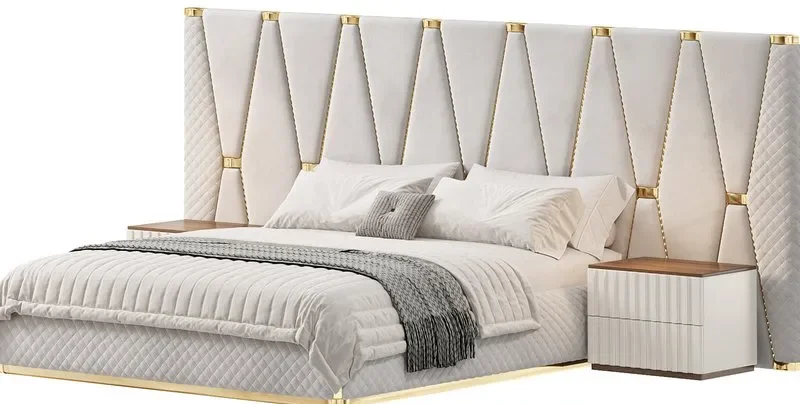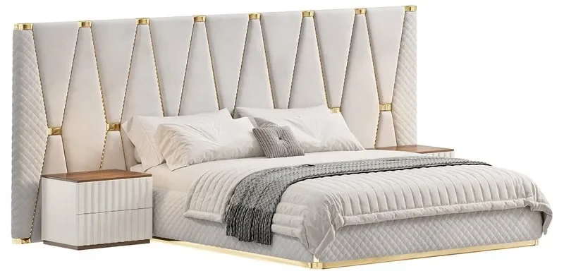 La base de la cama sigue el mismo estilo, con un acolchado sutil y detalles dorados en las esquinas, creando armonía con la cabecera. Las mesas de noche a juego, con tiradores y bases doradas, complementan perfectamente el diseño. El uso de colores neutros como el blanco y el gris, combinado con los toques dorados, hace que esta cama sea una excelente opción para espacios con un estilo moderno y glamuroso."