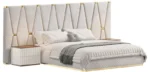El conjunto incluye mesas de noche integradas, con cajones funcionales que presentan detalles metálicos elegantes, aportando un equilibrio entre funcionalidad y diseño. Esta cama es ideal para dormitorios contemporáneos que buscan una combinación de lujo, modernidad y comodidad.