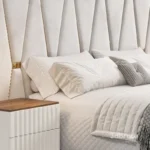 "Este modelo de cama tiene un diseño elegante y moderno con una cabecera curva y acolchonada en un estilo capitoné vertical. El tapizado en blanco con detalles metálicos en los bordes le da un aspecto sofisticado y limpio. La base de la cama sigue la misma línea de diseño, con un acabado acolchado que envuelve toda la estructura, proporcionando un aspecto armonioso. Los muebles complementarios, como las mesas de noche blancas con líneas minimalistas, refuerzan la estética contemporánea.