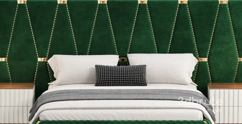 Este modelo de cama y cabecera destaca por su diseño moderno y sofisticado, con un enfoque en líneas limpias y detalles elegantes. La cabecera es amplia y de gran altura, con un diseño geométrico que incorpora paneles acolchonados dispuestos en ángulos sutiles, creando un efecto visual dinámico y refinado. Además, cuenta con detalles decorativos enmarcados que añaden un toque de exclusividad y lujo.