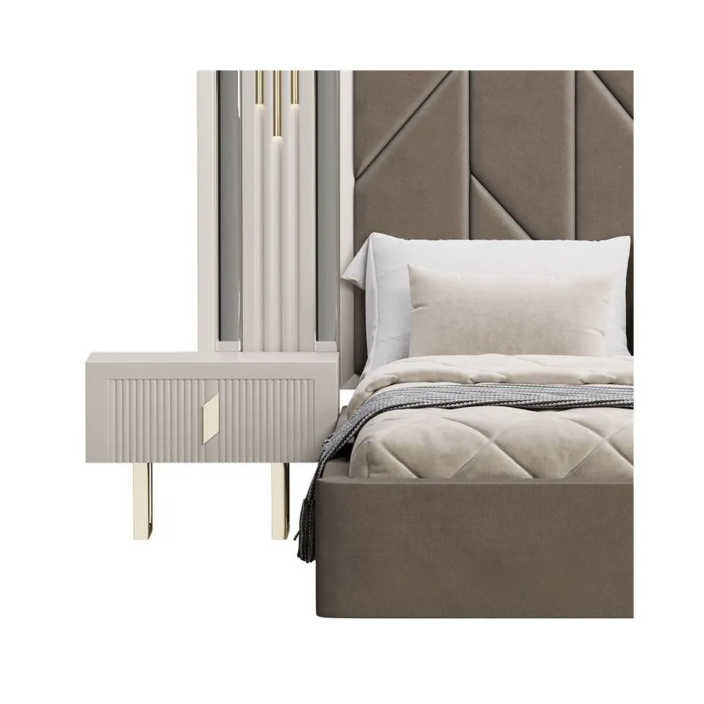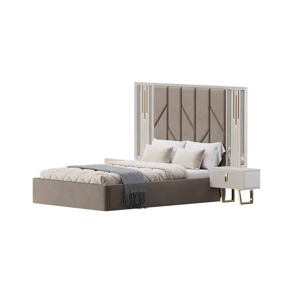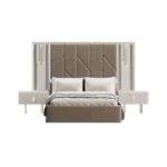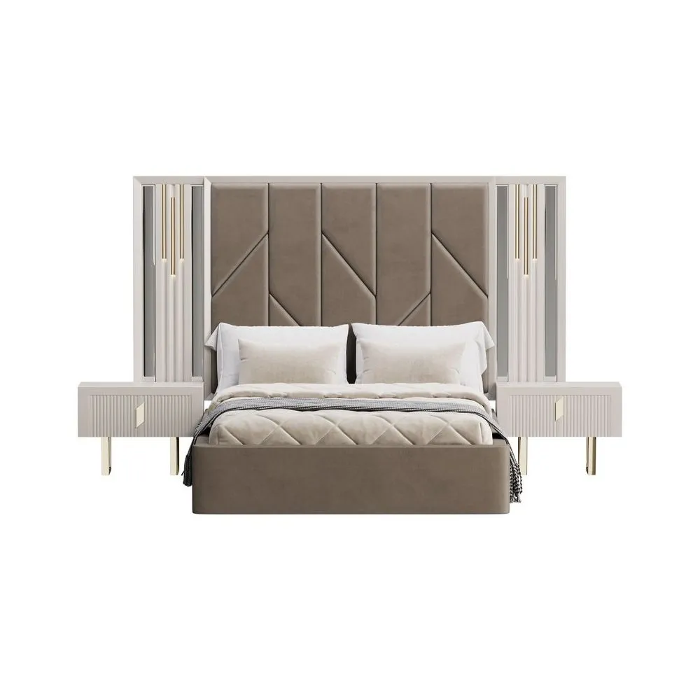El conjunto incluye mesas de noche integradas, con cajones funcionales que presentan detalles metálicos elegantes, aportando un equilibrio entre funcionalidad y diseño. Esta cama es ideal para dormitorios contemporáneos que buscan una combinación de lujo, modernidad y comodidad.