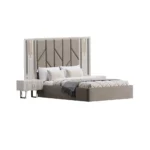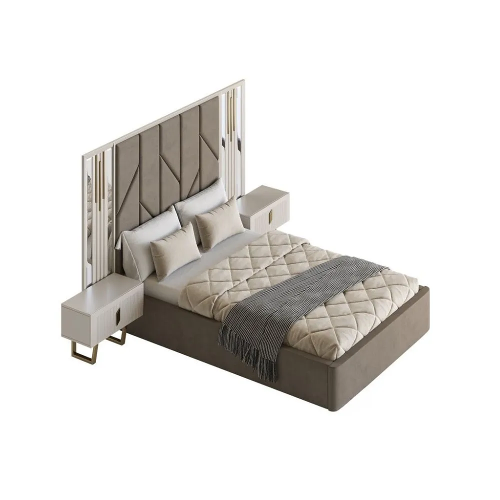 Este modelo de cama y cabecera destaca por su diseño moderno y sofisticado, con un enfoque en líneas limpias y detalles elegantes. La cabecera es amplia y de gran altura, con un diseño geométrico que incorpora paneles acolchonados dispuestos en ángulos sutiles, creando un efecto visual dinámico y refinado. Además, cuenta con detalles decorativos enmarcados que añaden un toque de exclusividad y lujo.