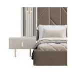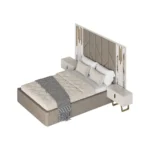 La base de la cama mantiene una estética armoniosa con la cabecera, garantizando estabilidad y solidez. Su tapizado suave y bien acabado brinda una sensación acogedora y cálida. Además, el diseño se complementa con mesas de noche minimalistas que añaden funcionalidad sin restar elegancia.