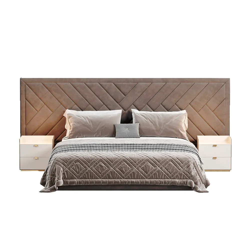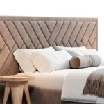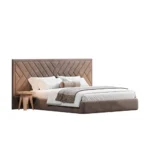 Este modelo de cama y cabecera destaca por su diseño moderno y sofisticado, con un enfoque en líneas limpias y detalles elegantes. La cabecera es amplia y de gran altura, con un diseño geométrico que incorpora paneles acolchonados dispuestos en ángulos sutiles, creando un efecto visual dinámico y refinado. Además, cuenta con detalles decorativos enmarcados que añaden un toque de exclusividad y lujo.