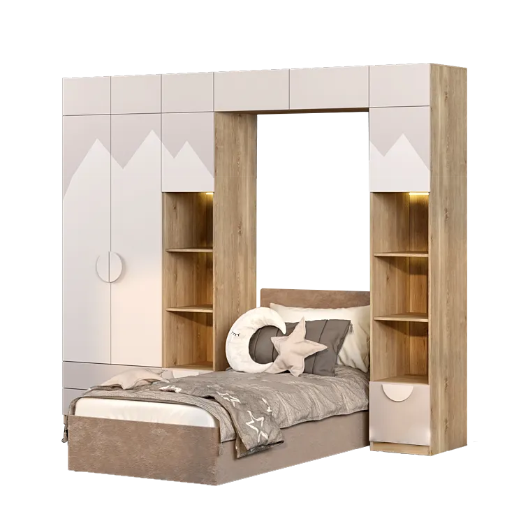 - Decoración con motivos de montañas en las puertas superiores, creando un ambiente natural y relajante en el dormitorio.