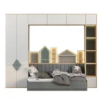 - El colchón se complementa con cojines en tonos neutros y mostaza, creando un ambiente acogedor. Perfecta para habitaciones infantiles, esta cama integra descanso, almacenamiento y diseño en una sola estructura funcional y moderna.
