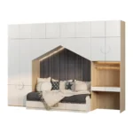 - El colchón se complementa con cojines en tonos neutros y mostaza, creando un ambiente acogedor. Perfecta para habitaciones infantiles, esta cama integra descanso, almacenamiento y diseño en una sola estructura funcional y moderna.