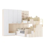 - El colchón se complementa con cojines en tonos neutros y mostaza, creando un ambiente acogedor. Perfecta para habitaciones infantiles, esta cama integra descanso, almacenamiento y diseño en una sola estructura funcional y moderna.