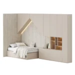 - El colchón se complementa con cojines en tonos neutros y mostaza, creando un ambiente acogedor. Perfecta para habitaciones infantiles, esta cama integra descanso, almacenamiento y diseño en una sola estructura funcional y moderna.