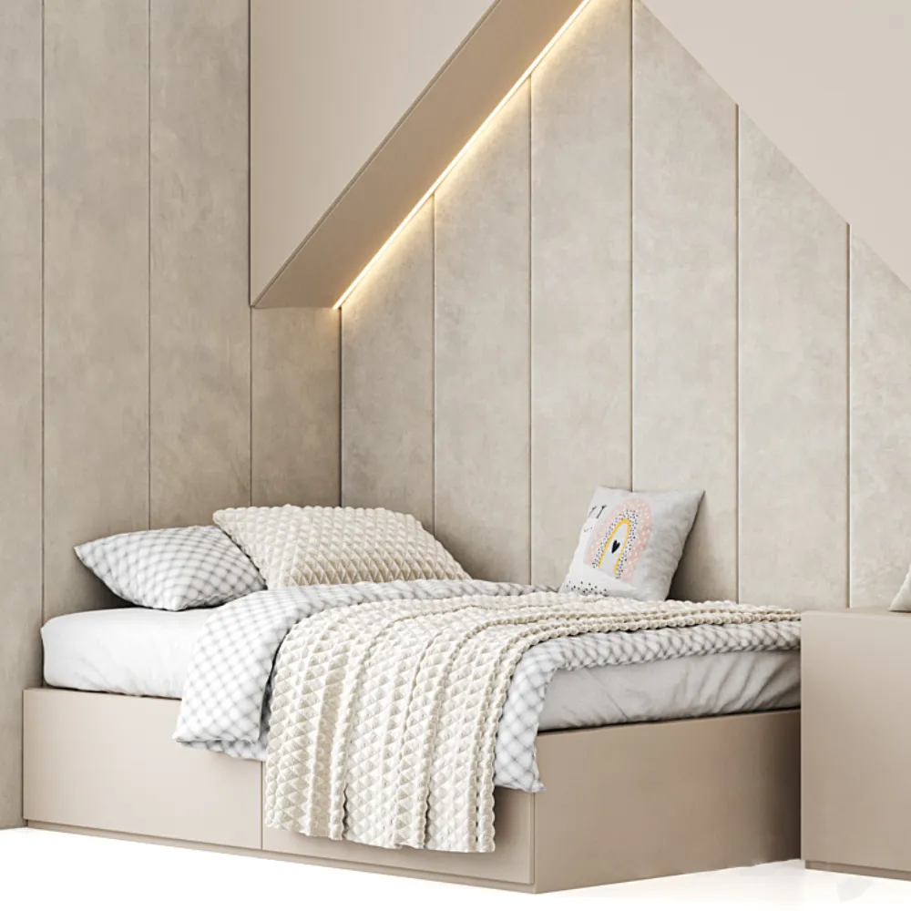 - Cama individual con un cabecero acolchado que proporciona comodidad y un toque elegante.