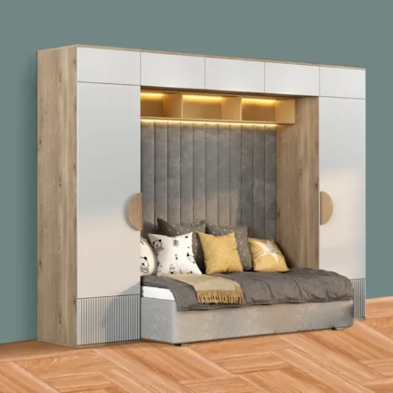 - Estantes abiertos laterales: Perfectos para libros, juguetes o elementos decorativos, con iluminación integrada que realza su estética.