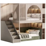 - El colchón se complementa con cojines en tonos neutros y mostaza, creando un ambiente acogedor. Perfecta para habitaciones infantiles, esta cama integra descanso, almacenamiento y diseño en una sola estructura funcional y moderna.