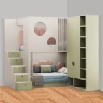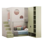 - El colchón se complementa con cojines en tonos neutros y mostaza, creando un ambiente acogedor. Perfecta para habitaciones infantiles, esta cama integra descanso, almacenamiento y diseño en una sola estructura funcional y moderna.
