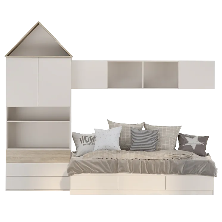 - Elemento decorativo en forma de casita en la parte superior del armario lateral, añadiendo un toque lúdico y original.