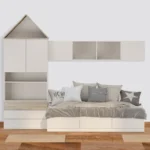 - El colchón se complementa con cojines en tonos neutros y mostaza, creando un ambiente acogedor. Perfecta para habitaciones infantiles, esta cama integra descanso, almacenamiento y diseño en una sola estructura funcional y moderna.