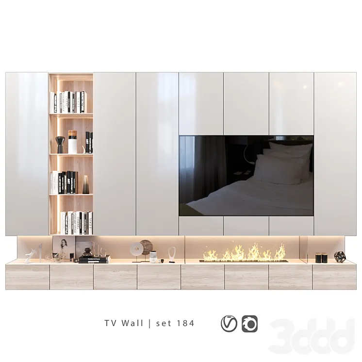 La base neutra se extiende, proporcionando espacio para dispositivos y almacenamiento oculto. Una chimenea eléctrica integrada añade calidez. La combinación de elementos crea un diseño equilibrado. Ideal para salones modernos que buscan funcionalidad y estética.