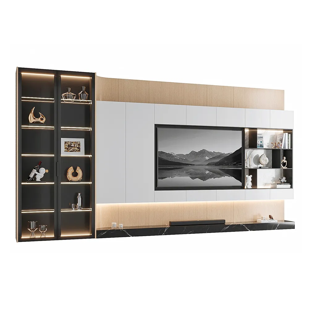 Diseñado para televisores de gran tamaño, este conjunto no solo es visualmente impresionante, sino también altamente funcional. Cuenta con amplias estanterías abiertas iluminadas y gabinetes cerrados para ofrecer una solución de almacenamiento elegante y discreta para tus dispositivos multimedia, libros y decoración.