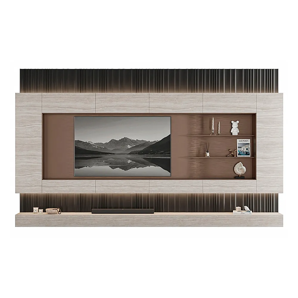 Este centro de entretenimiento fusiona elegancia y funcionalidad, proporcionando una solución sofisticada para organizar y resaltar el área de televisión. Su estructura envolvente enmarca el televisor con un diseño moderno y equilibrado. Incorpora compartimentos cerrados para almacenamiento discreto y estanterías abiertas ideales para exhibir libros, adornos o equipos multimedia. La iluminación integrada en los bordes realza la estética y aporta un ambiente acogedor. Con una disposición práctica y acabados de alta calidad, este mueble es perfecto para complementar espacios contemporáneos y maximizar la organización en el hogar.