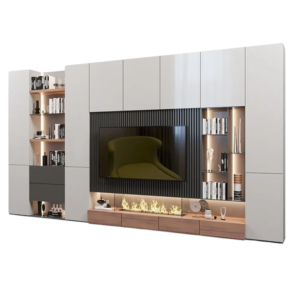 Diseñado para televisores de gran tamaño, este conjunto no solo es visualmente impresionante, sino también altamente funcional. Cuenta con amplias estanterías abiertas iluminadas y gabinetes cerrados para ofrecer una solución de almacenamiento elegante y discreta para tus dispositivos multimedia, libros y decoración.
